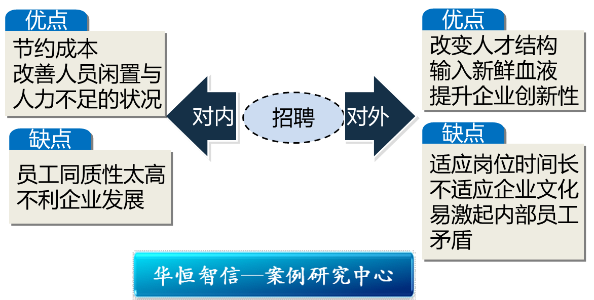 对某个特定岗位,在决定对外招聘还是对内招聘的时候,应该将这两种方式的利弊综合起来考虑。对外招聘是改变人才结构,输入新鲜血液的主要渠道,企业的创新性也有一定程度的提升。但是这种方式相比对内招聘,适应岗位时间长,且有不适应企业文化、激起内部员工矛盾的风险。对内招聘能够节省成本,改善人员闲置与人力不足的状况,但同时也有员工同质性太高,有企业发展的不利方面。只有将各种因素综合起来考虑,灵活地运用以上两种方法,才能在招聘工作中取得成效。