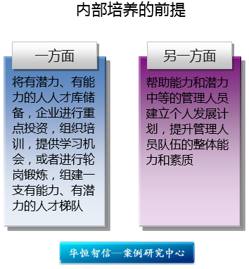 企业发展,产生一些新的岗位,需要人才补充,原则上有两个途径:外部人才招聘和内部人才发展。内部培养的前提是对所有管理人员进行胜任能力评估,从能力评估、业绩评估、潜力评估三个方面进行,评估后分为三六九等,优秀的或者有潜力的重点发展,不合格的淘汰。一方面,将有潜力、有能力的人人才库储备,企业进行重点投资,组织培训,提供学习机会,或者进行轮岗锻炼,组建一支有能力、有潜力的人才梯队。另一方面,帮助能力和潜力中等的管理人员建立个人发展计划,提升管理人员队伍的整体能力和素质。