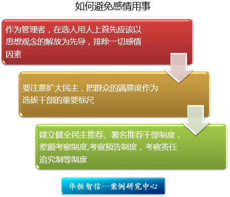 “心底无私天地宽”,作为管理者,在选人用人上首先应该以思想观念的解放为先导,排除一切感情因素。以识人的智慧、用人的胆魄和容人的雅量,一切从战略高度出发,不搞亲疏,不以人划线。真正把那些能干事、肯干事、干成事的干部及时选拔到领导岗位上来。其次,要注意扩大民主,把群众的满意度作为选拔干部的重要标尺。防止偏听偏信,扩大群众在干部选任上的知情权、参与权、选择权和监督权。其三,建立健全民主推荐、署名推荐干部制度,差额考察制度,考察预告制度,考察责任追究制等制度,变“伯乐相马”为“赛场赛马”,建立起科学的选人用人机制,切实提高干部选任工作的准确性。
