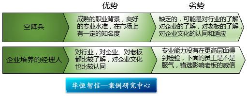 而企业培养的经理人,一般来说他们对行业,对企业、对老板都比较了解,对企业文化也比较认同,这些是他们的优势。他们的劣势是在专业方面,以前有的专业能力没有在更高层面上得到检验,不知道他们能不能胜任岗位,下面的员工是不是服气。如果选择错误,那将是企业最大的成本,将损害老板的威信。