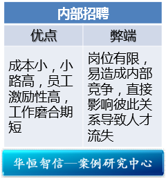 总体来说,内部招聘的优点主要在于成本小、效率高、员工激励性强、工作磨合期短等方面,而内部招聘的弊端往往在于岗位有限,易造成内部员工竞争,直接影响彼此关系甚至导致人才流失。另外,内部招聘如果控制不好,易滋生内部的“近亲繁殖”、“团体思维”、“长官意志”等现象,不利于企业的开放创新和茁壮成长。