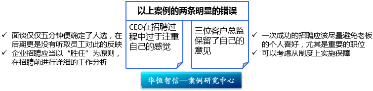 第一,CEO在招聘过程中过于注重自己的感觉。面谈仅仅五分钟便确定了人选,在后期更是没有听取员工对此的反映。一般来说,企业招聘应当以“胜任”为原则,这就需要在招聘前进行详细的工作分析。工作分析能够明确岗位职责以及上岗能力要求,从而为招聘者提供较为合理的甄选依据,只有符合岗位素质能力要求的人,才能被企业录入。这样,招聘过程将更加科学,所招人员实现岗位胜任的可能性也就越大。