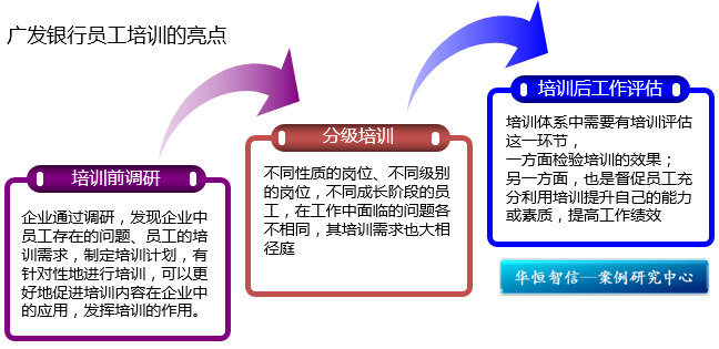 广发银行从培训前的调研、培训计划的设计、培训的具体实施,以及培训之后通过反馈进行结果验收这四个方面详细叙述了其人才培育的整个过程,体现了其培训体系的全面性与系统性。