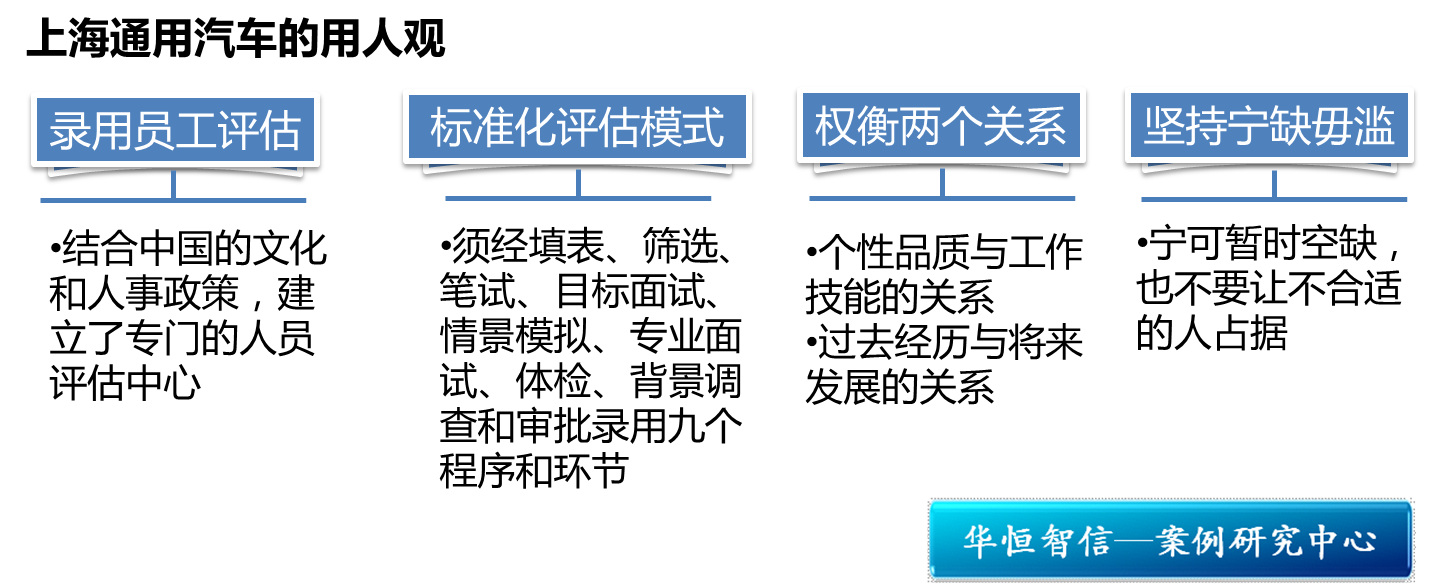 华恒智信认为在上海通用的招聘方面做得比较出色的是其标准化的招聘流程,从标准化的招聘流程当中浸透了企业的文化以及用人理念,这是求职者在对企业文化以及对企业管理了解的窗口。招聘环节在一定程度上起着对企业的宣传作用。对于招聘的录用比例问题,如果比例太小就会造成企业招聘到的员工质量没有保证,同时也对企业的声誉产生影响。求职者会因为很容易就能够得到目标岗位,那么没有通过激烈竞争就能够得到的工作岗位会使员工感受不到岗位的重要性,使员工不珍惜自己已经获得的岗位,从而使用人效率下降。同时,在没有的到岗位的人员,通过参加企业的招聘,感受不到企业的招人的严谨,致使他们对企业的管理等产生怀疑,以至于在他们进行口碑宣传时候出现一个较差的口碑等。如果把招聘录用比例增大,加大招聘池,这样使求职者竞争激烈,就会是求职者更加珍惜目前的工作,同时即使没有获得目标岗位,他也可以通过参加招聘的过程感受到企业用人的严谨性,通过招聘环节企业的知名度等。