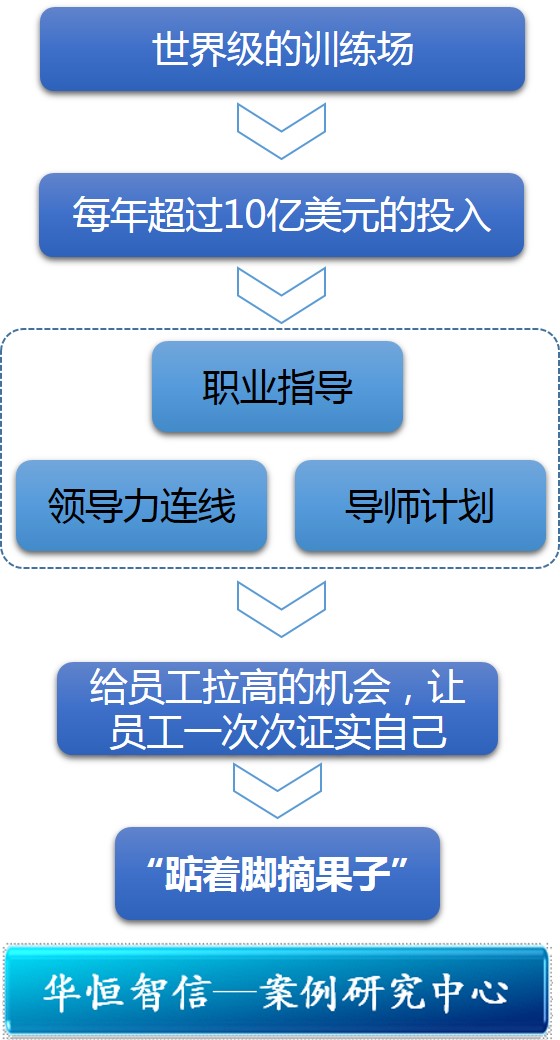 为了让员工踮着脚能够摘到更多果子,GE准备了丰富的帮助员工提升的职业发展项目,比如领导力连线、导师计划、职业指导等。这里有世界级的训练场,GE全球每年在培训上的投资超过10亿美元,仅在GE中国培训与发展中心,每年接受培训的员工就超过5000人次。一旦从普通员工进入领导梯队,则需要摘更高树上的果子,GE有60年历史的来自全球的领导力培训项目,30%的GE领导者参加过领导力培训。“如果一个部门的领导休产假了,上级主管一定会把这个锻炼机会交给他最强的下属,看他是否能胜任。如果考核通过,此人将被委以重任。这样的GE人才通道不胜枚举。”王晓军说。