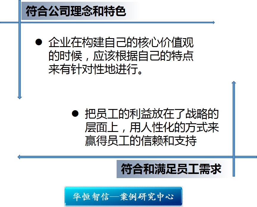 1.符合公司理念和特色。企业文化就好比企业的鞋子,穿上一双合适的鞋子,才能走得轻松和平稳。优秀的企业文化很多,但是一种优秀的企业文化并不是万能的,企业在构建自己的核心价值观的时候,不能照搬照抄其他企业的模式,应该根据自己的特点来有针对性地进行。