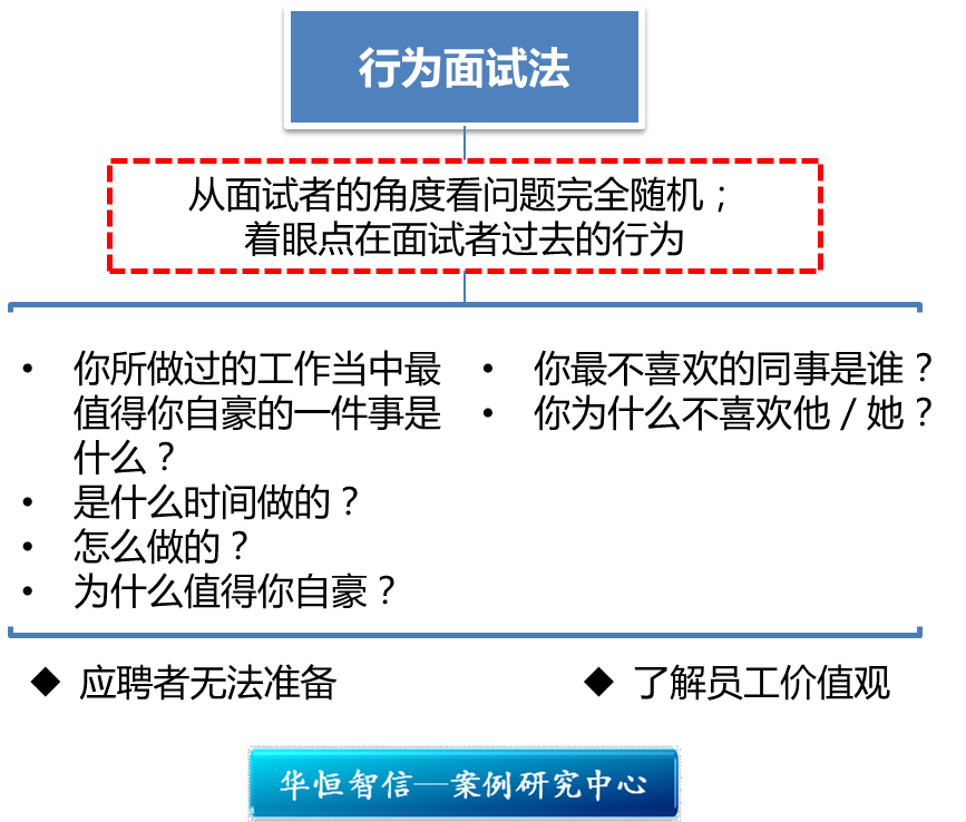 戴尔公司的面试官有二种问法:(1)围绕工作当中最值得自豪的一件事展开提问。(2)说出一个最不喜欢的同事及原因。这些问题并没有标准的答案,但是面试官会在应聘者的回答中获得有用信息。这就是戴尔的行为面试法。它为很多公司提供了一个好的范例,但是这种面试方法的成功非常考验HR的技巧和经验。那么,在这过程中HR需要注意和把握哪些问题呢?华恒智信的老师有以下建议: