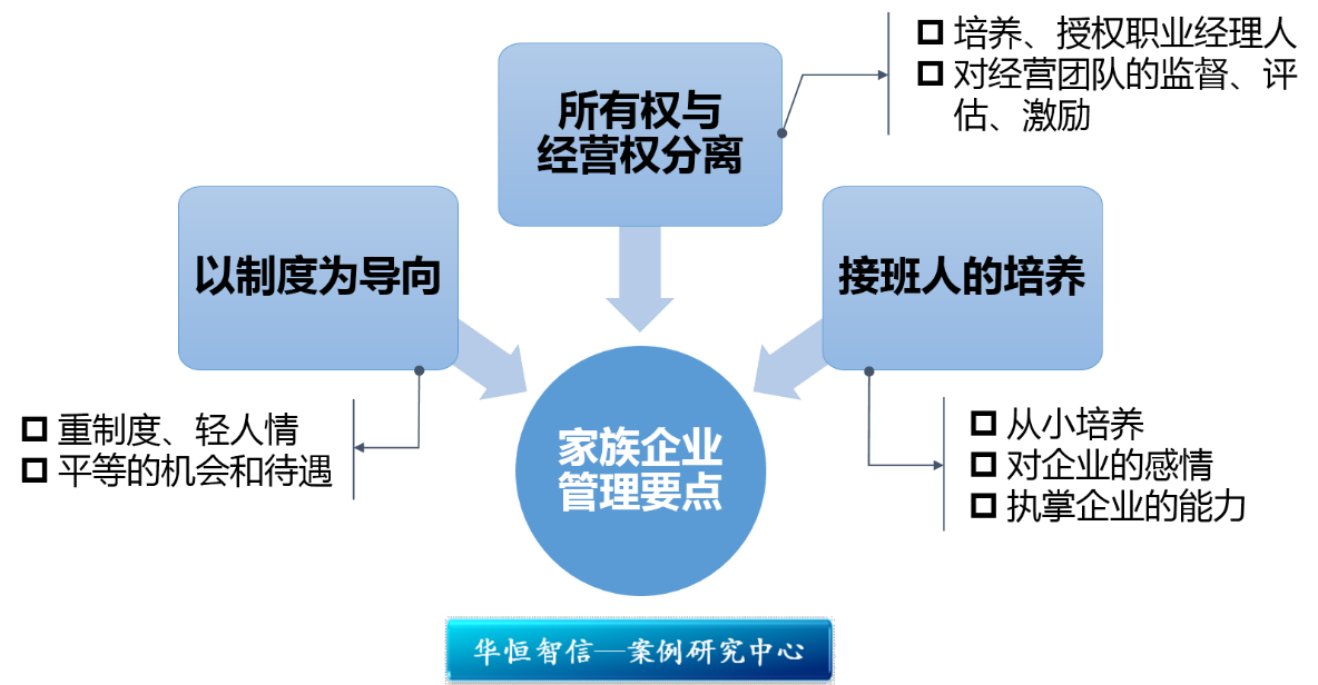 沃尔玛作为全球第一的家族企业,任用家族外的人才掌管公司高级管理职能,同时将家族成员培养成“负责而又富有建设性的沃尔玛股东”,融合家族化与职业化,同时保障了公司利益与家族利益。在我国上市的民营企业中有相当比例都具有家族性质,对于家族企业的管理问题,华恒智信专家认为有以下要点:
