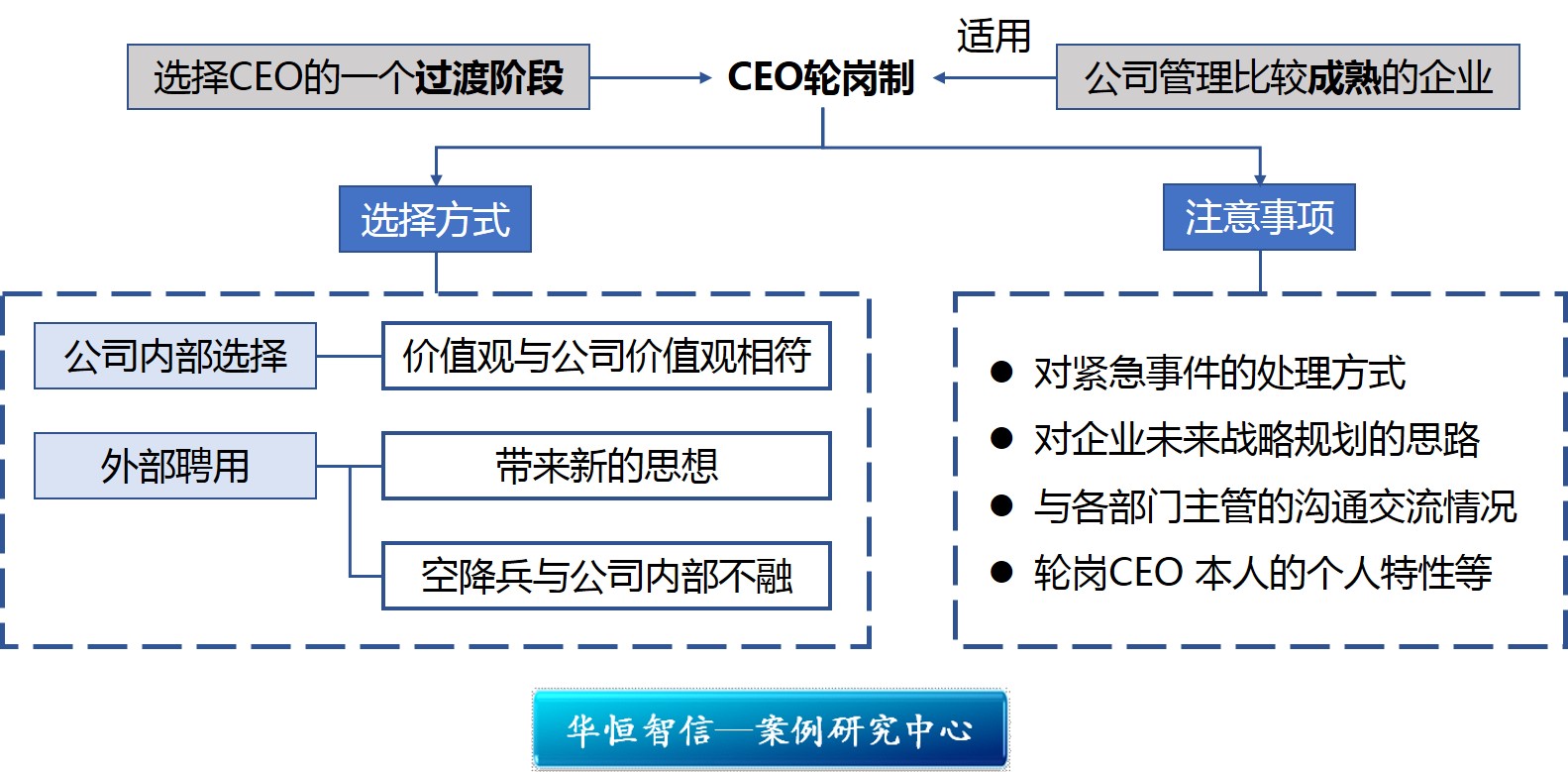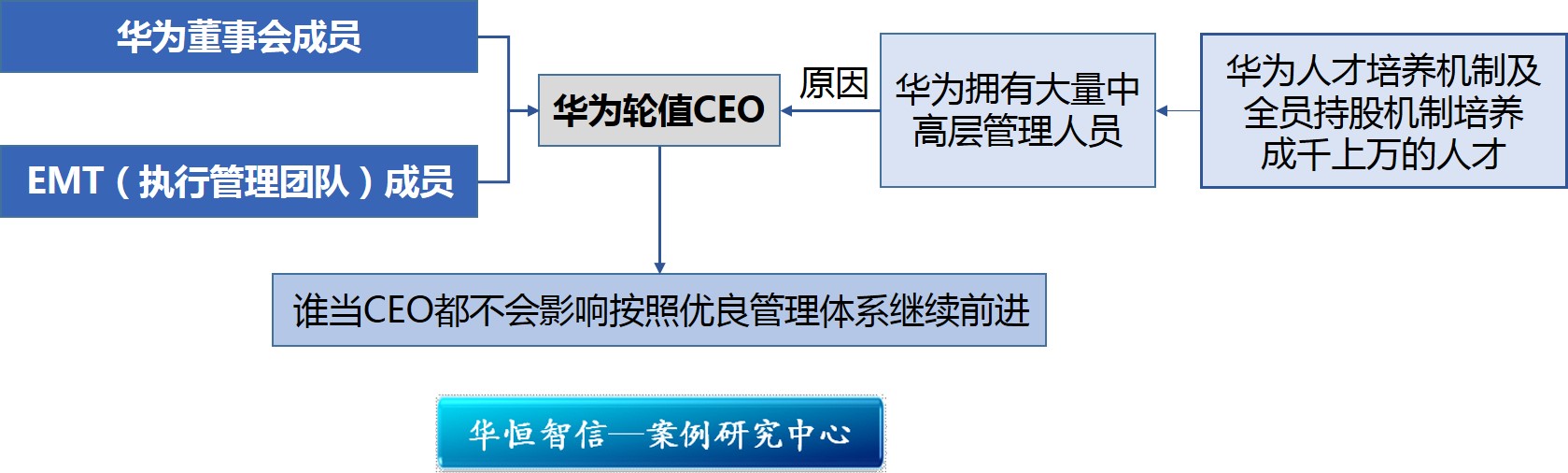 坚持以客户利益为核心价值观的华为董事会,授权一群高层管理者轮值CEO,让他们集体的智慧作出决策,每人任期6个月,这就是华为的CEO轮岗制。轮岗制给华为的高层人员一个成为CEO机会,华为凭借着将国际所有领先的流程和机制融入日常经营和管理工作中,使得无论哪位CEO在位,都不会影响公司按照优良管理体系继续前进。目前,许多企业都在思考如何选择一位最适合CEO,对此,华恒智信提供以下几条思路供企业管理者借鉴: