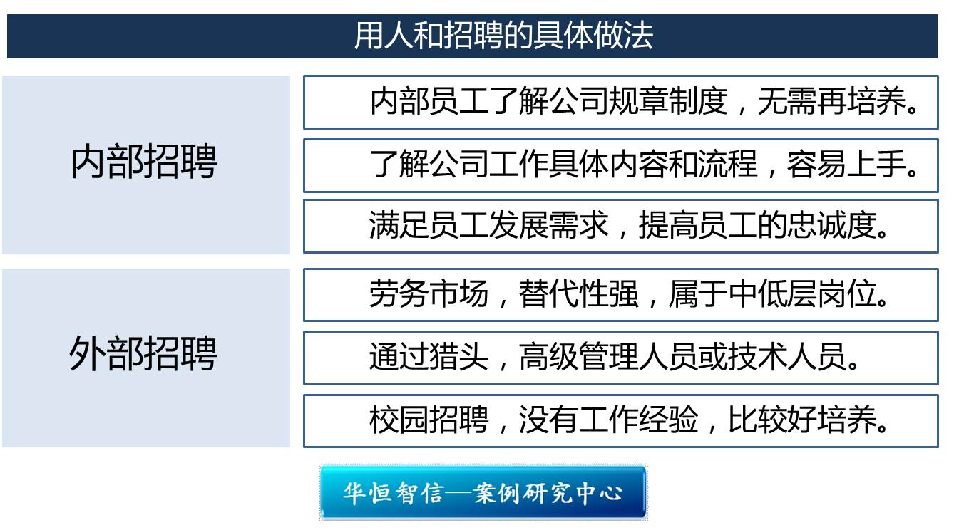 第一,企业出现职位空缺时,首先采用内部招聘。通用公司就是采用的优先内部招聘的政策。当缺员时,先在公司张贴公告,感兴趣的人员可以通过自荐和面谈等形式获得职位。只有当公司内无合适人选的时候,才会再考虑外部招聘。