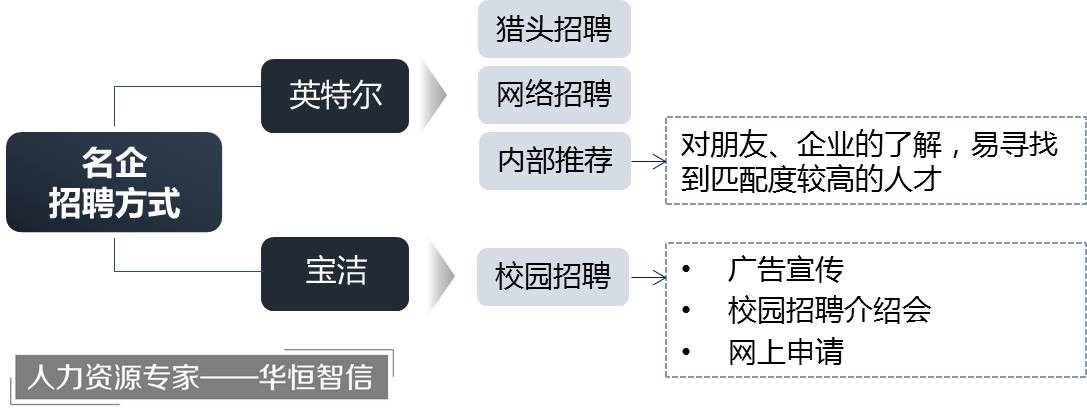 笔者认为在招聘实施工作中,招聘渠道的选择是直接影响招聘效果的重要一环。英特尔和宝洁选择的招聘渠道其实正是常见的两种招聘渠道,即内部推荐和外部招聘。所谓内部招聘,就是当公司出现空缺的位置时,主要是通过提拔内部员工来解决招聘问题;外部招聘则主要是吸收外部新鲜血液来解决招聘问题。两种渠道各有利弊。