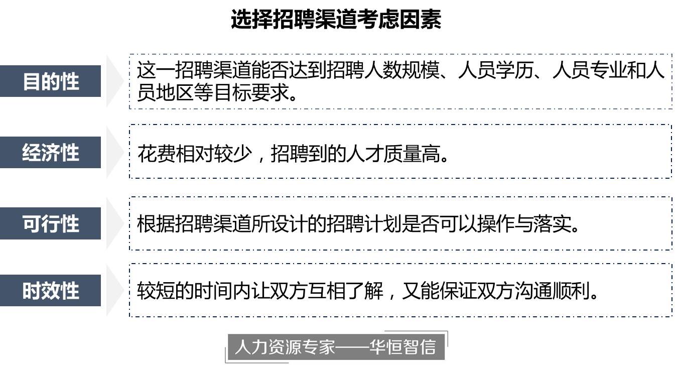 笔者认为,选择招聘渠道应该考虑几个方面:目的性,招聘渠道的选择是否能够达到招聘的要求;经济性,在招聘到合适人员的情况下所花费的成本最小;可行性,选择的招聘渠道是否符合现实情况,具有可操作性;时效性,既要能在短时间内建立公司和求职者的相互了解,又要保证双方沟通足够便利。企业需要根据其发展阶段、招聘职位特点以及各类招聘渠道的优势和劣势,对招聘渠道进行择优使用与合理搭配组合。