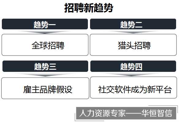 前程无忧凭借其移动化的招聘新模式,满足了现今绝大部分用户的需求,得到了用户们的热烈追逐,也因此在人力资源服务行业取得了骄人的成绩。这一切都离不开其对现在互联网大趋势的准确把握,离不开对招聘领域的最新动态的时刻关注和对招聘模式的深刻探索。现在身处互联网时代,为了招聘到优秀的人才,企业必须洞悉人力资源招聘领域的新趋势。这里,华恒智信分析员将为您就这一话题做一简单介绍: