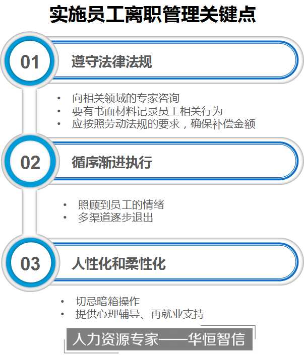 人员退出有很多途径,在职位退出与组织退出之间存在缓冲地带,比如内部待岗、离岗培训,还有员工自主自愿选择的内部创业、提前退休等途径。所以,企业人员的退出要根据客观实际情况,同时照顾到员工的情绪,循序渐进的推进,多渠道逐步退出。比如可以建立再雇佣渠道,调查显示,“财富500强”企业通过积极返聘前任员工,平均每家企业每年能节约1200万美元的成本。对公司来说雇用一个熟悉本职工作的离职员工与招聘一个新手的成本相比要低得多。通过精细的离职员工管理,可以减少员工离职时对外界进行负面的宣传、降低公司机密外泄的风险、并树立良好的、负责任的雇主品牌形象和发展潜在的合作伙伴。