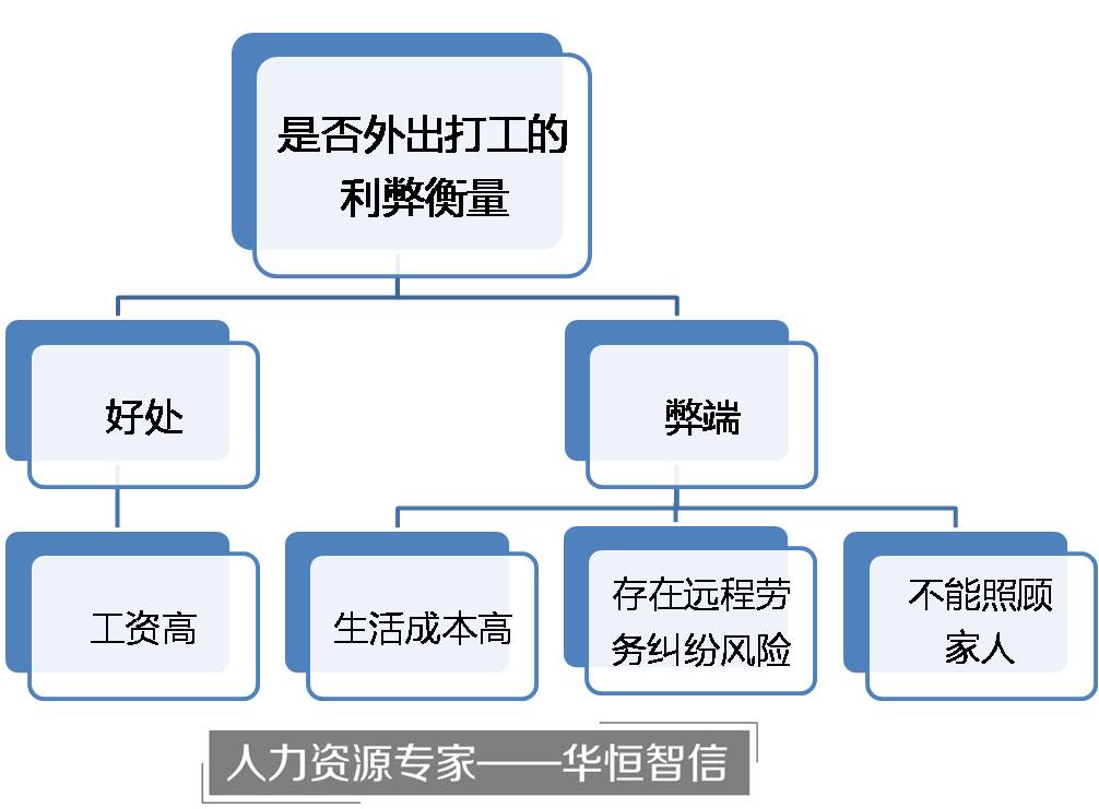 当求职者面对一份工作,选择应聘与否的关键,就在于其对这份工作的利弊衡量。例如,在云南省应聘者的心里,留在家乡的好处很多:工资足够生活、生活成本低、方便照顾家人。而北京的工作虽然工资高,但弊端也非常明显:生活成本高、家人不能团聚、有发生劳务纠纷被辞退的风险。