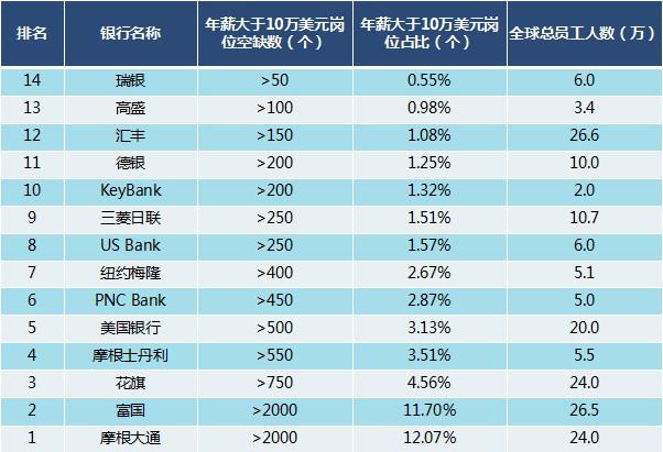 下面在此轮招聘中“最舍得下本钱”的14家华尔街投行,提供的年薪10万以上岗位共有1万个左右: