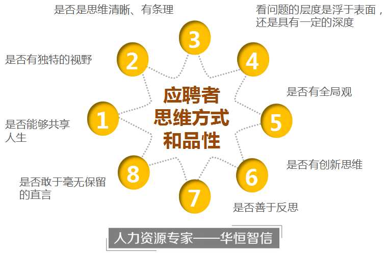 例如,桥水基金正在招聘的合规性审计职位的要求是“逻辑能力强、敢于毫无保留的直言,有清醒的自我认知、善于反思同时善于从错误中学习、进步。”同时,华恒智信认为考查应聘者思维方式的时候,应该注重应聘者是否有独特的视野,是否是一个思维清晰,有条理的人,看问题的层度是浮于表面,还是具有一定的深度,是否有全局观,是否有创新思维。只有这样,面试官才能为企业招到合适的人才。