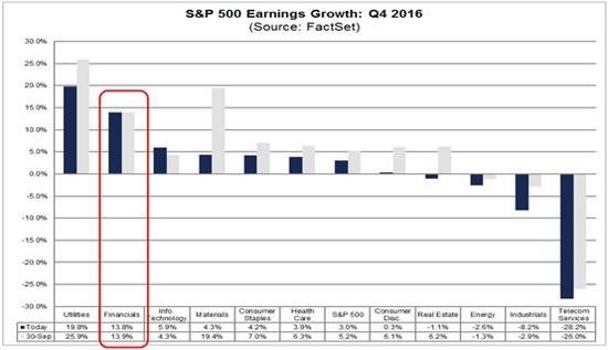 从十年前金融危机到现在,华尔街的银行们终于可以扬眉吐气了。据FactSet数据,2016年三季度银行业盈利增速为8%,显著高于标普500公司的3.1%。