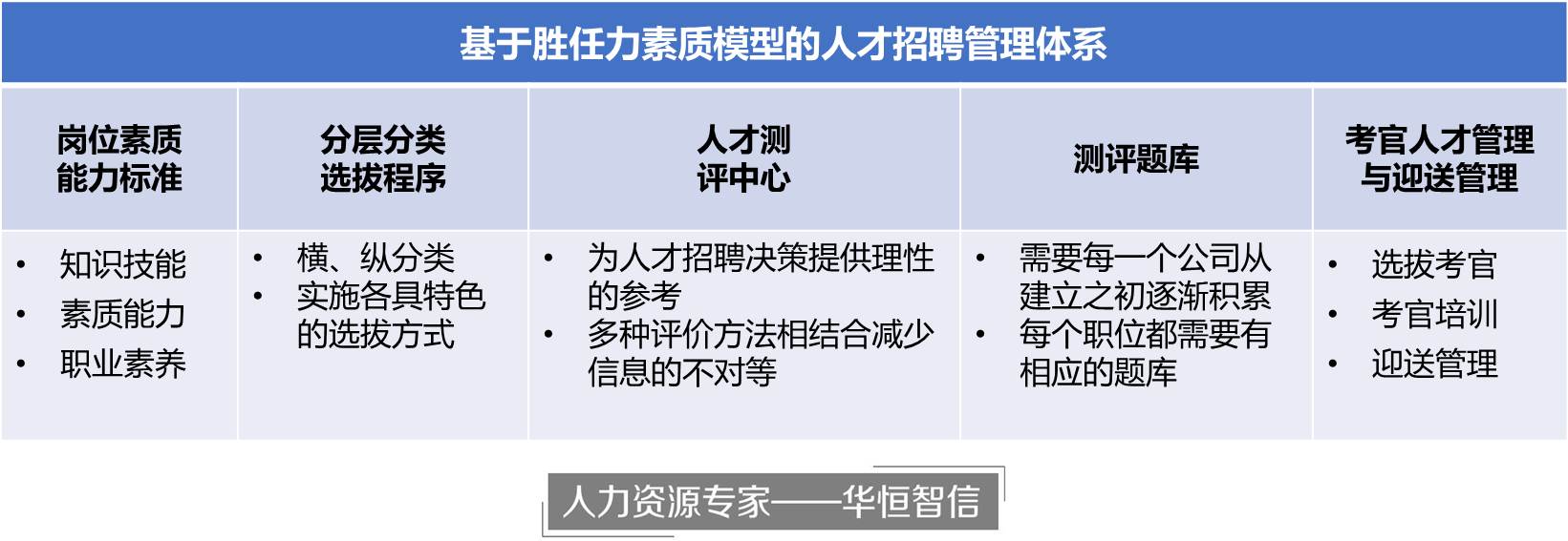 华恒智信基于上述问题,经过大量实证分析后开发了一套“基于胜任力素质模型的人才招聘管理体系”来解决企业招聘缺基础与缺方法的问题。该体系具体包括:岗位素质能力标准;分层分类的选拔程序;人才测评中心;测评题库;考官人才管理以及迎送管理等。该系统的核心是以岗位潜能素质的量化为基准,帮助企业量化和明确岗位所需要的人才必须具备的真正素质标准,能力标准与经验标准等。