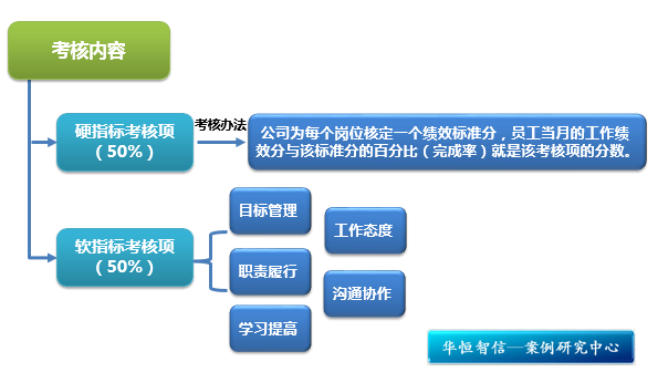 A公司的绩效考核内容分为硬指标考核项与软指标考核项两大部分。两部分指标对员工绩效考核结果的影响各占50%.硬指标考核项主要是工作业绩考核,该考核办法为:公司为每个岗位核定一个绩效标准分,员工当月的工作绩效分与该标准分的百分比(完成率)就是该考核项的分数。其中员工的工作绩效分=∑(某项工作的标准工时×该项工作完成系数×该项工作质量系数),每项工作的标准工时由员工的直接主管在每月制定工作计划时与员工确认,完成系数、质量系数由直接主管在月底绩效考核时评定。