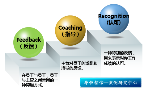 在制定了目标后的1年里,每个员工在执行目标时会有来自三个方面的互动影响,一种是Feedback(反馈),一种是Coaching(指导),还有一种是Recognition(认可)。