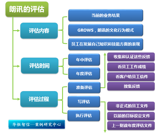 评估围绕三个方面进行:一个是当前的业务结果,这是针对当初的业务目标进行的,通过比较每位员工自己设定的目标和完成的目标,以决定他这一项的效果如何。第二个评估内容是GROWS,朗讯的文化行为模式;第三个是员工在发展自己的知识和技能方面做得如何。每位员工一年中有两次评估,一次是年中评估,这个时间在半个财政年度执行,主要看目标的执行情况;财政年度的评估则是看达到了目标没有。