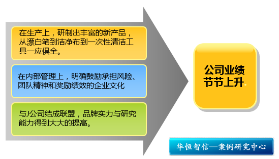 在生产上,研制出丰富的新产品,从漂白笔到洁净布到一次性清洁工具一应俱全;在内部管理上,明确鼓励承担风险、团队精神和奖励绩效的企业文化,还培养起高管了解产品、巡访商店以及接触员工和客户的风气,经理们很少系领带,经常光顾零售商店的家用清洁用品货架等,从而使员工的敬业精神得到鼓舞;且在2010年11月,与老牌竞争对手B公司和侧重于男用化妆品的J公司结成联盟,品牌实力与研究能力得到大大的提高,进一步开阔了市场。公司的业绩节节上升。