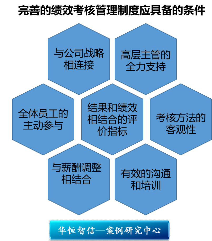对于以上两家公司绩效考核结果的差异,最重要的当然是与是否满足绩效考核的前提条件相关的,但同时也是与绩效考核制度是否完善分不开的。我们知道,PAS是一个体系,涵盖了人力资源管理的诸多方面,任何一个环节出了问题,都会影响最终的结果。对于完善的PAS而言,一般应具备以下几个条件 :