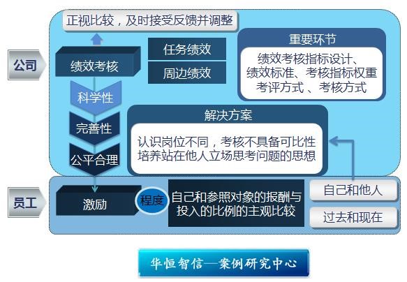那么如何让员工更多地感受到公平呢,美国心理学家约翰•斯塔希•亚当斯(John Stacey Adams)于1965年提出公平理论,认为员工的激励程度来源于对自己和参照对象的报酬和投入的比例的主观比较感觉。主观感觉来自于两种比较,自己过去与现在的比较,以及自己与他人的比较。比较难的就是第二种,企业中很多工作往往不是通过眼睛就能识别贡献程度的,因此,华恒智信认为,此时最好的办法,就是让员工认识到不同岗位之间,考核结果是不具备可比性的,除非工作性质、工作内容、工作条件完全一样;同时在思想上,要多培养员工站在他人立场思考问题的思想,让员工了解不同岗位的工作难度及贡献,以达到相互理解的目的;当然,最重要的,也是最基础的,还是考核体系的科学性,要经得起员工的推敲,博得员工的信任,不能太离谱。