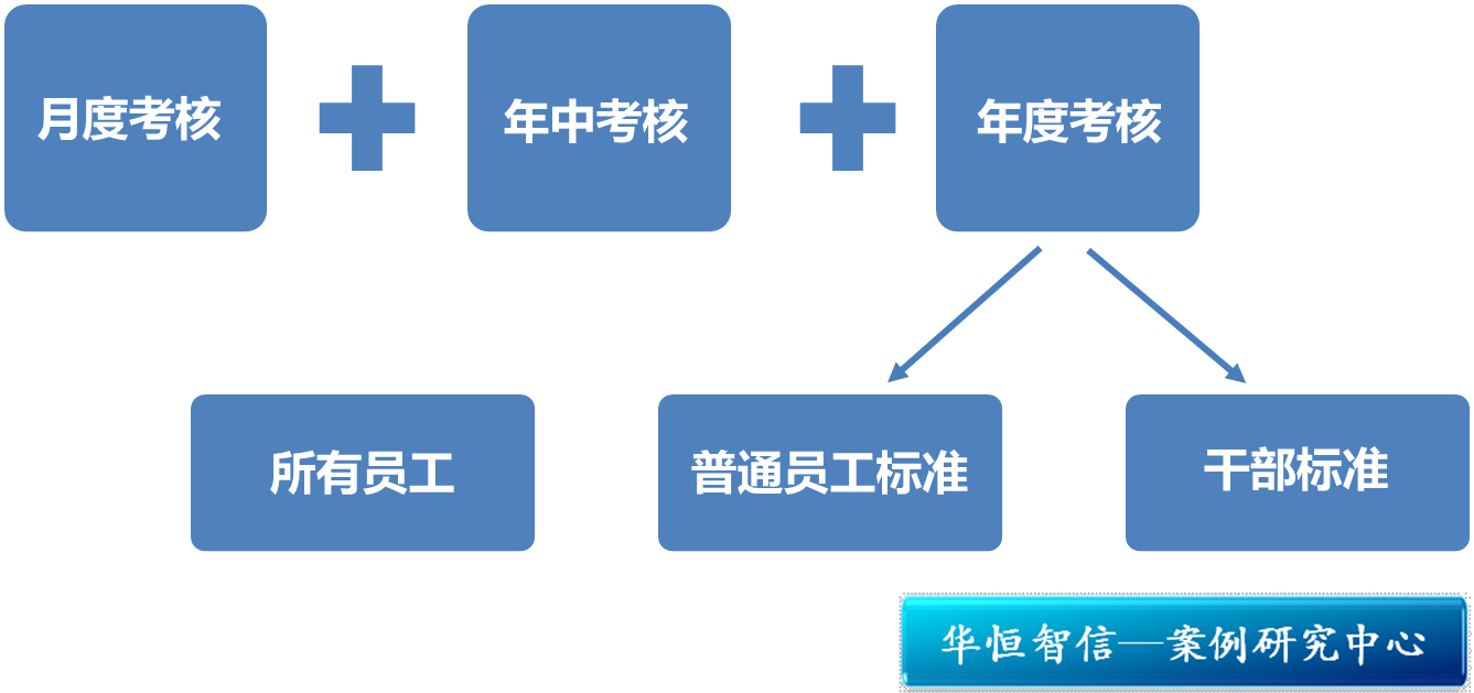 目前A集团员工绩效考核一般由三个部分构成:月度考核+年中考核+年度考核。和多数公司的考核相似,月度和年中考核的标准适用所有员工,年度考核则更有针对性地分为普通员工标准和干部标准。