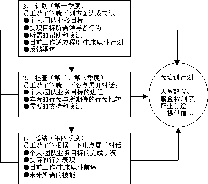 员工制定目标的执行要求老板和下属参与。摩托罗拉每3个月会考核员工的目标执行情况。员工在工作中有一个联系紧密的合作伙伴,摩托罗拉称之为KEY WORK PARTNER,他们彼此之间能够相互推动工作。跨部门同事和同部门同事之间有紧密联系,使考核达到360度的平衡。