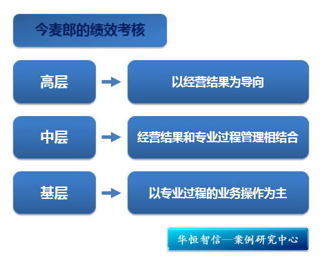 现在,今麦郎的绩效管理变革已经完成。在绩效考核中,对高层实行经营结果为导向;中层经营结果和专业过程管理相结合;基层人员的考核指标以专业过程的业务操作为主,以保持其稳定性。在对财务这样的行政部门的考核中,也涉及了很多专业技能之外,但对其他部门起到支持作用的工作内容。