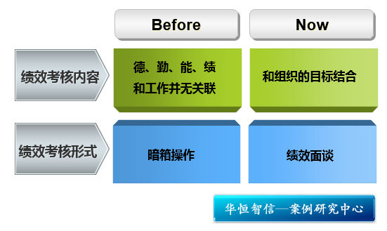 今麦郎从绩效考核到绩效管理的演变过程同样存在于其他企业。虞翔也感到,与过去相比,如今企业在考核的内容和形式上有了明显的提升,原来考核的内容是德、勤、能、绩,和工作并无关联,现在和组织的目标结合起来了,另外考核的形式也从原来的暗箱操作变成了绩效面谈。这是两个最明显的改变。