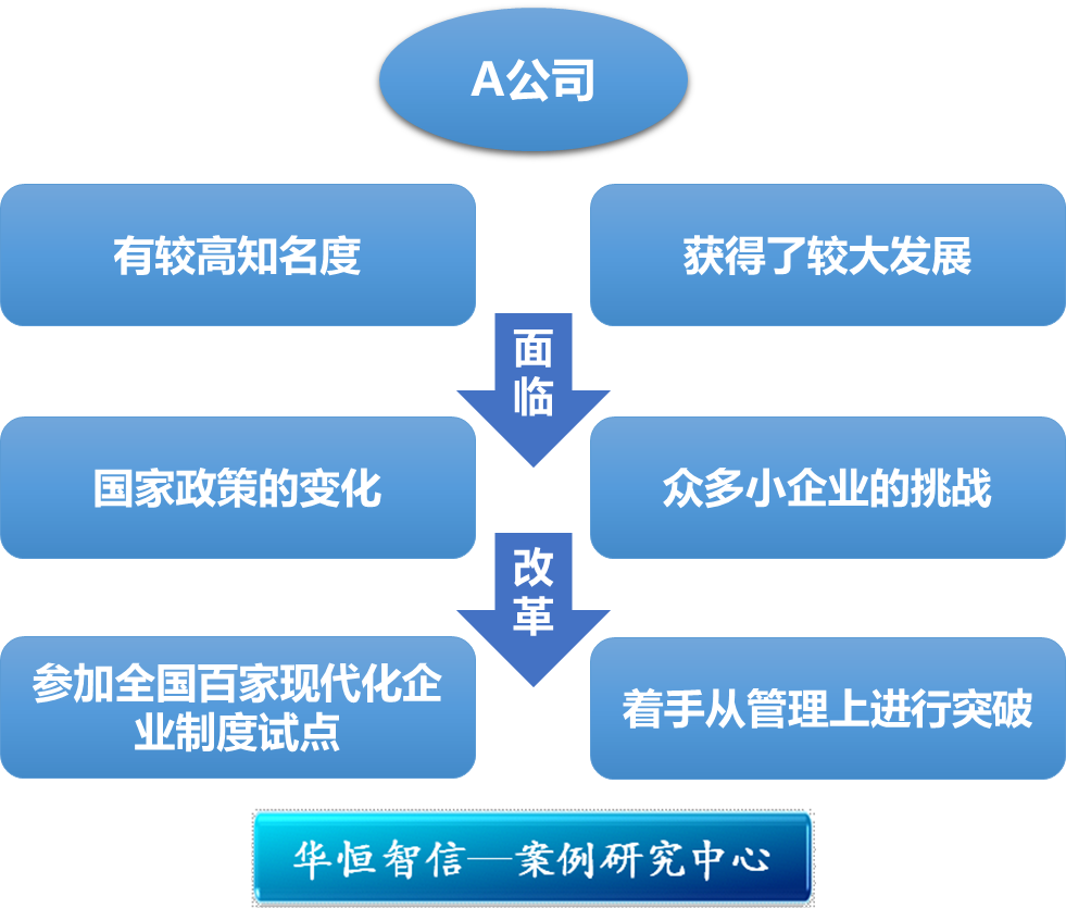 A公司,成立于五十年代初。经过近五十年的努力,在业内已具有较高的知名度并获得了较大的发展。目前公司有员工一千人左右。总公司本身没有业务部门,只设一些职能部门;总公司下没有若干子公司,分别从事不同的业务。在同行业内的国有企业中,该公司无论在对管理的重视程度上还是在业绩上,都是比较不错的。由于国家政策的变化,为此公司该公司面临着众多小企业的挑战。从前几年开始,一方面参加全国百家现代化企业制度试点;另一方面着手从管理上进行突破。