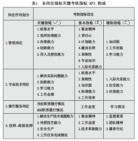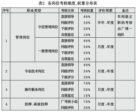 其中,对管理人员侧重经营指标、工作目标实现的考核,对专业技术人员侧重解决实际问题的能力、技术成果实现的考核,对操作服务人员侧重安全运行、正确操作的考核。