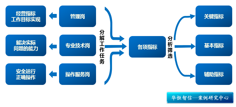 确定考核指标时,我们对管理、专业技术、操作服务三类岗位的工作任务进行分解,确定影响工作任务完成得各项指标,并通过对各项指标的分析、筛选,找出影响战略目标、工作任务完成的关键指标(A)、基本指标(B)、辅助指标(C),从而确定出影响岗位工作任务、工作目标完成的关键要素,即员工关键业绩指标(KPI)。