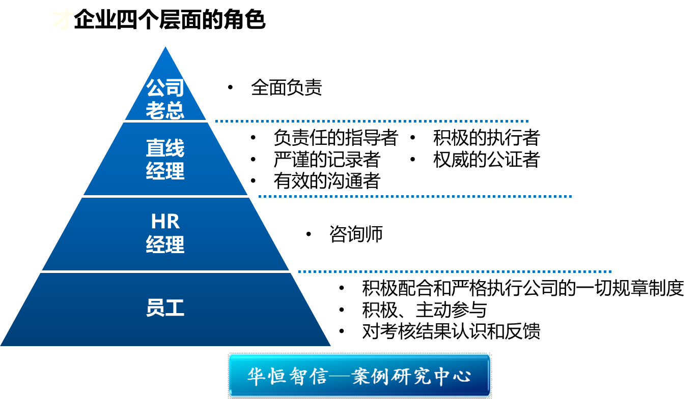 通常来讲,一个企业有四个层面的角色,分别是:公司老总、HR经理、直线经理和员工。绩效考核工作作为企业绩校管理系统中的一个环节,同样需要企业各层面人员的支持和配合才能完成,而不能只靠人力资源部门的单兵作战。那么在即将到来的年终考核工作中,为避免出现上述考核结果不理想的状况,企业各层面人员到底应该充当怎样的角色、发挥怎样的作用呢?