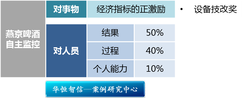 对事务的自主监控,主要是通过经济指标的正激励来实现。燕京啤酒制定了很多单项奖励,促进员工积极发现问题并解决问题,如“设备技改奖”,鼓励员工“小改小革”使3.6瓶/小时的广轻线生产效率大幅度提高,可以连续工作10多天。通过设立种种单项奖励使啤酒质量、消耗、效率等指标得到提升。如通过多年运营,每吨酒耗水已经降到了4吨以下。另外,燕京啤酒通过绩效飞轮来保证生产安全、质量、成本等结果指标的完成,从而减少传统管理思想中守在流水线的末端“出了问题再算账”而造成的纠错成本。