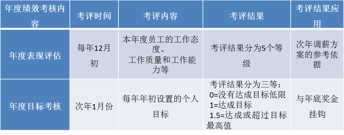 每年的12月初开始启动,对每个员工本年度的工作态度,工作质量,工作能力等方面进行综合考评。由上级经理按照规定的表格内容结合员工的表现进行客观的考评。考评者和被考评人需要进行面对面的沟通,最终打出合理的分值。考评结果分为5个不同的等级。此结果会成为次年调薪方案的重要因素。