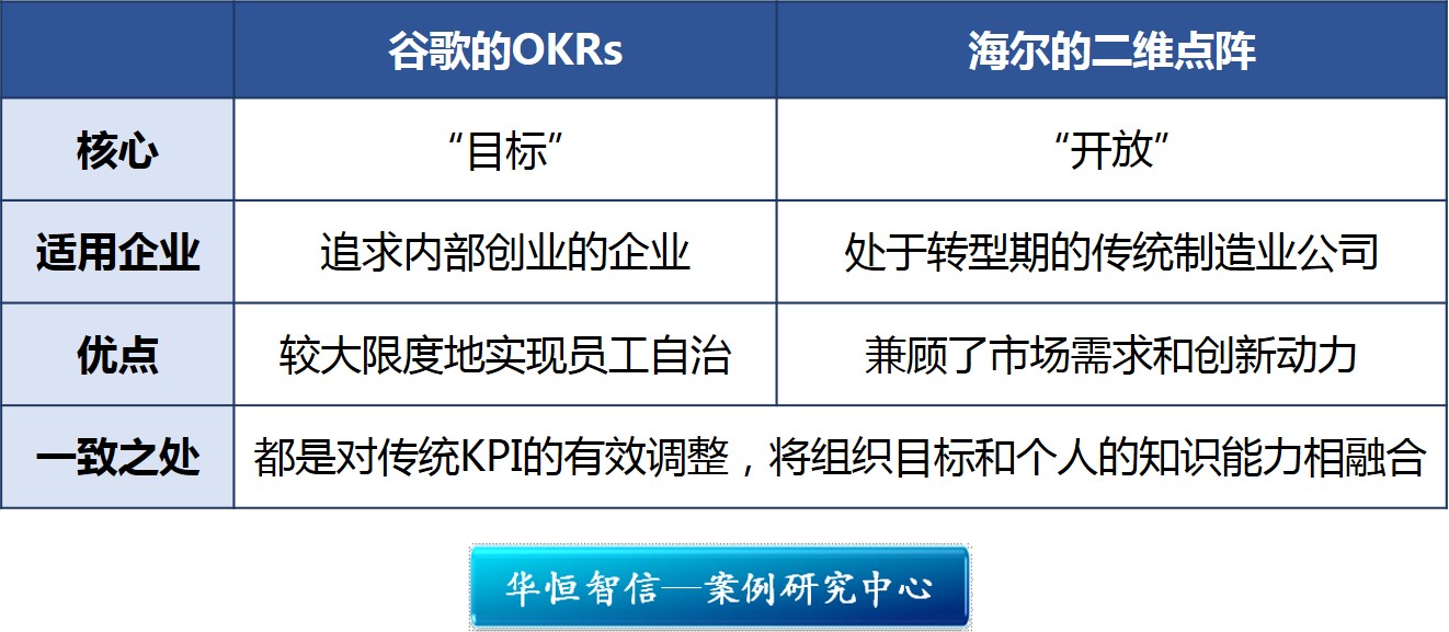 无论是谷歌的OKRs还是海尔的二维点阵,都是对传统KPI的有效调整。OKRs更注重员工的自主创新性,追求自下而上。海尔的二维点阵追求的是传统企业对互联网规律的适应性,不再以“上/下”为推动力,而是统一由市场来决定。