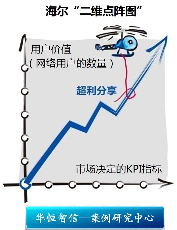 二维点阵同样适用于海尔对小微的考核上。小微和孵化平台之间签署对赌协议的时候,横轴和纵轴都是考量标准。一方面,张瑞敏在逼着海尔人触网。另一方面,这也是让海尔坚固的内部自行开放的催化剂。对于不懂网络的传统制造业的员工来说,最好的办法就是请来懂网络的人。