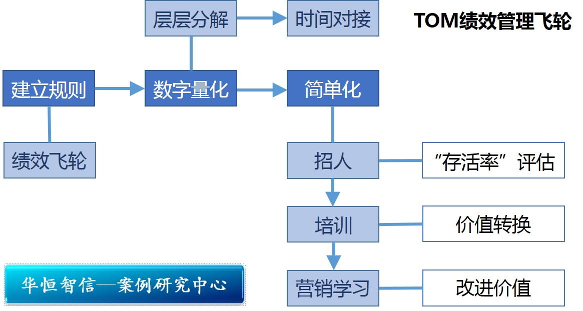 而数字量化具体是如何做到的?在TOM的绩效飞轮中,第一步就是:层层分解。公司会将整体收入以及成本、利润等经济指标,逐一分解到下面的经理头上,然后由经理再次向下层层分解,直至分解到每个员工的头上。有了这些数字分解还不够,还要进行时间分解,还要有年、月的全部分解。李践说,公司2007年的各项数字早在2006年12月之前就已经全部分解出来了,他们在做之前就已经知道了目标和数字是多少,他们会准确地把所有数字分解到每月,每周,甚至是每日。