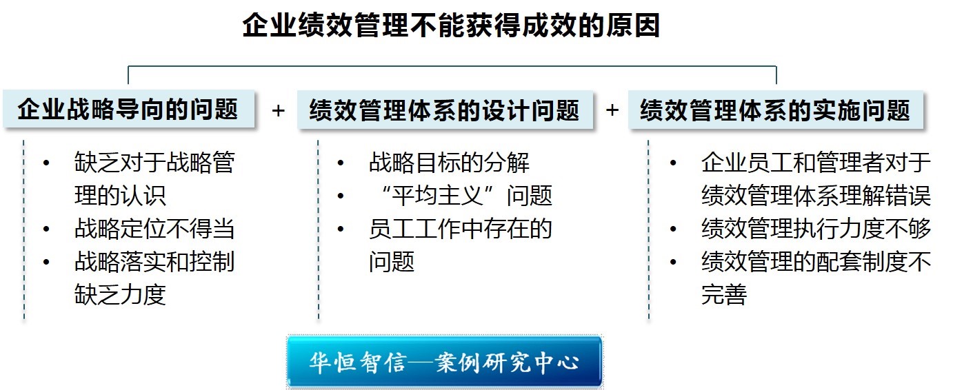 华恒智信分析员认为,对于天外伺郎先生所提出的“绩效主义毁了索尼”这一观点,其观点的正确与否尚且需要进一步探讨,但是绩效管理的确在索尼中没有发挥其应有的作用,这也是目前很多中国企业在绩效管理中存在的问题。那么企业的绩效管理之所以不能获得成效的原因在何处呢?华恒智信分析员认为,主要是以下三个方面的原因造成的。