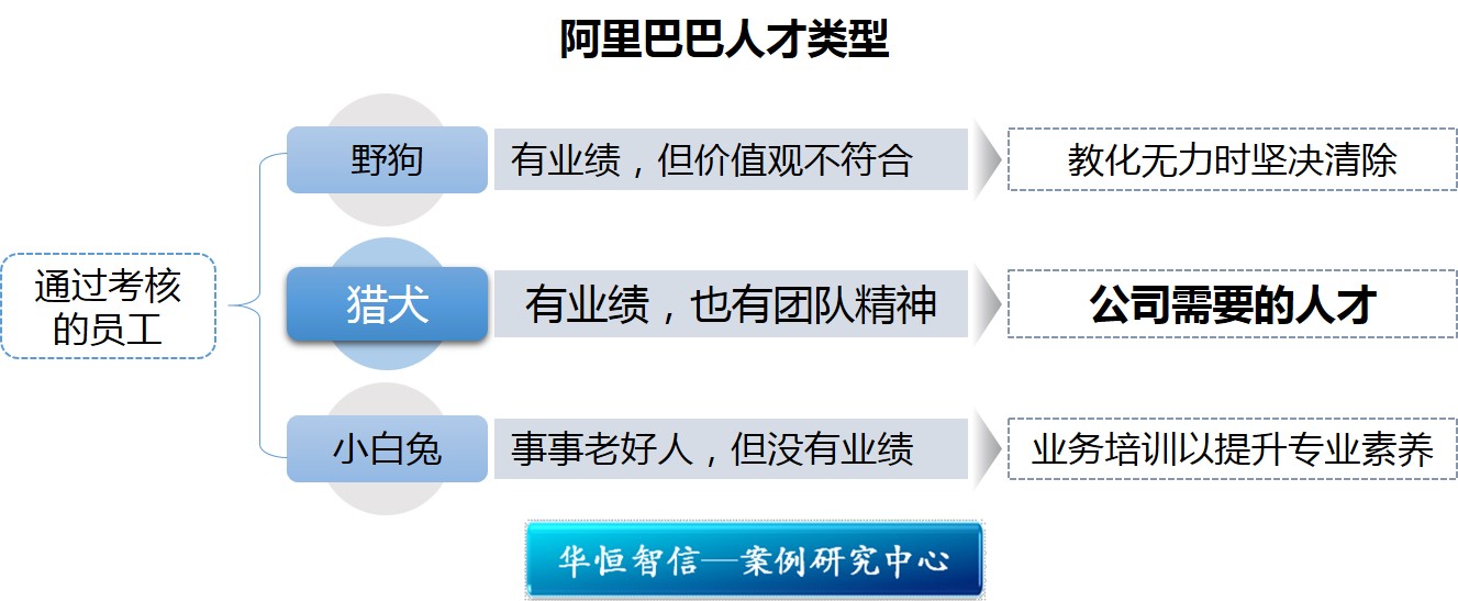 在阿里巴巴,员工通过考核被分成三种:一、有业绩,但价值观不符合的,被称为“野狗”;二、事事老好人,但没有业绩的,被称为“小白兔”;三、有业绩,也有团队精神的,被称为“猎犬”。