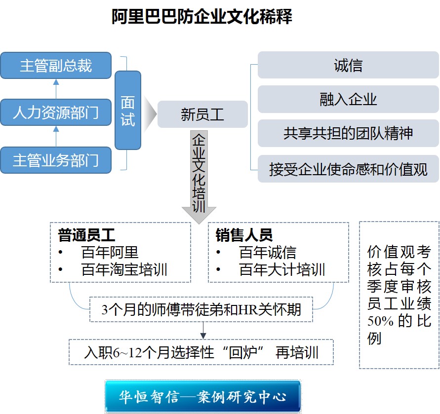 “价值观再好,这么多新员工的加入,也会面临企业文化被稀释的问题,我们希望通过招聘和培训,使企业文化被稀释得少一点,然后再慢慢回复过来。”卫哲说,为了解决这个难题,阿里巴巴特意为新员工设置3个月的师傅带徒弟和HR关怀期,而在入职6~12个月的时候还可以选择“回炉”接受再培训。