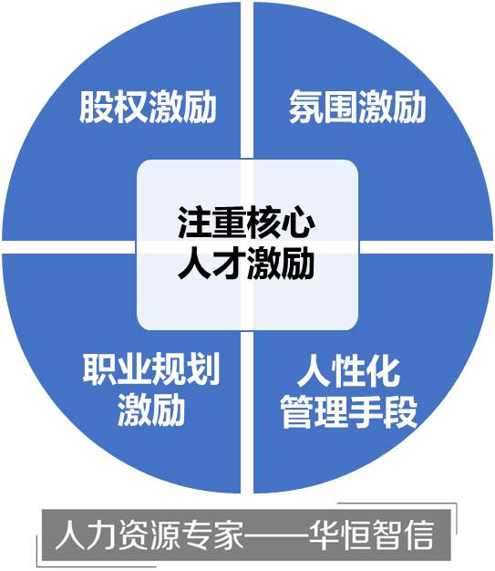 “管理的深处是激励”,华为即使在部门绩效不佳的情况下,也保证核心人才的薪酬上涨。以薪酬留人,同时要求人才完成薪酬规定的收入,有效增加了企业的产出。对于核心人才的管理,中小企业可以坚持人才培养“二八原则”,即将80%的资源用于20%创造核心价值的员工。企业不仅可以通过提高薪酬的方式留住核心人才,还可以通过“股权激励”的方式进行。如针对专业技术骨干,认同其知识价值,给予其股权,实现长期有效激励。除此之外,企业还可进行“氛围激励”,为员工提供良好的工作环境,丰富其工作内容,使其更具有挑战性;进行“职业规划激励”,为员工制定科学合理的职业生涯规划,让员工明确其在企业中的未来发展机会。最后企业可以采用以人文关怀为基础的人性化管理手段,留住核心员工,从而确保企业在未来仍能保持市场竞争力。