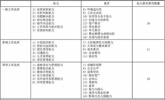 关于能力素质模型的补充说明:选用的能力素质模型分成三个特征组,体现不同导向:一般工作品质是最基础的能力素质,或者说,一个职业化的员工所应具备的能力和素质;管理工作品质是一般管理者所应具备的能力和素质,或者说,是管好具体事务所必须的能力素质;领导工作品质也就是领导者的胜任能力(或者说领导力),是一个领导者或者企业家所应具备的能力素质。