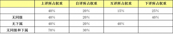2、由董事长、执行总裁、副总裁、助理总裁共6人组成评价小组(根据被评价人的职位差异,评价小组成员的权重有分类差别);
