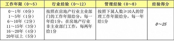 经验评价基于被评价人《个人传记调查表》中“来J公司前工作经验”、“本企业工作经验”的现状进行评分,经验评价得分=工作年限得分+房地产行业经验得分+管理经验得分。