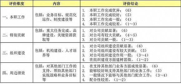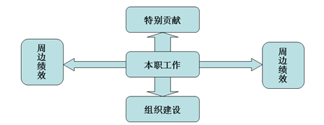 其中,“本职工作”衡量对整个组织的业务贡献;“特别贡献”衡量对整个组织做出的特殊贡献;“组织建设”衡量在培养人才,团队和机构建设方面的贡献;“周边绩效”衡量与其他部门配合,为其他部门服务所做出的贡献。